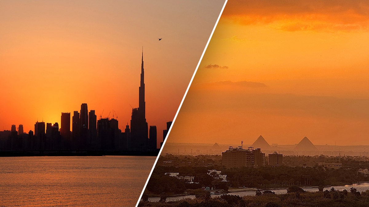 The spots in this roundup are some of the many locations around the world that offer spectacular sunset views. (Giuseppe Cacace/AFP via Getty Images | Wang Dongzhen/Xinhua via Getty Images)
