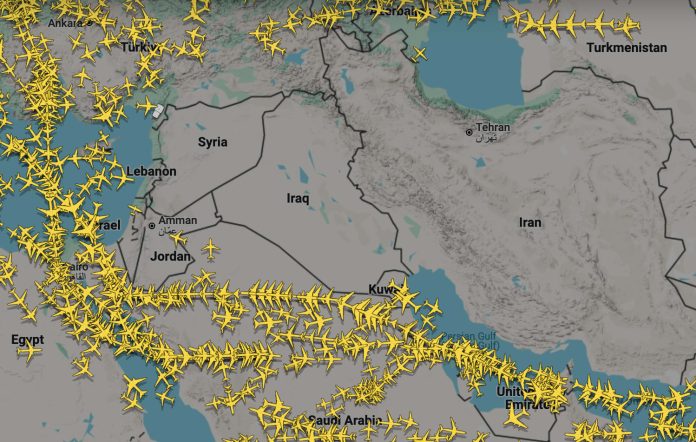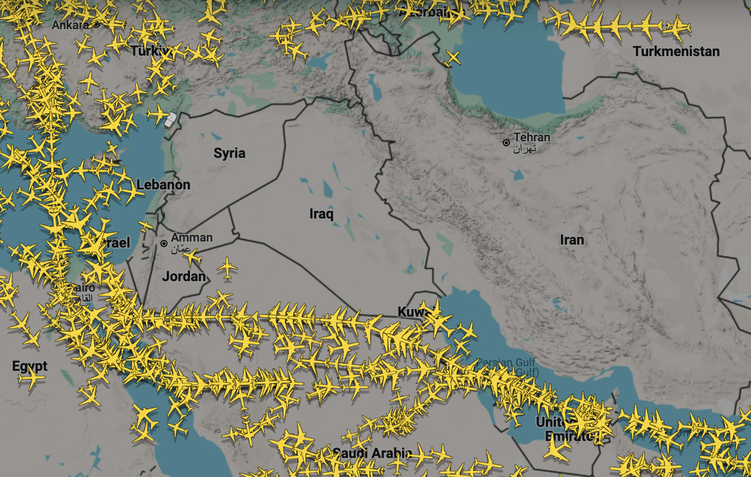 Flight map of the Middle East after Israel airstrikes on Iran at 12:25 UTC on June 13th, 2025.