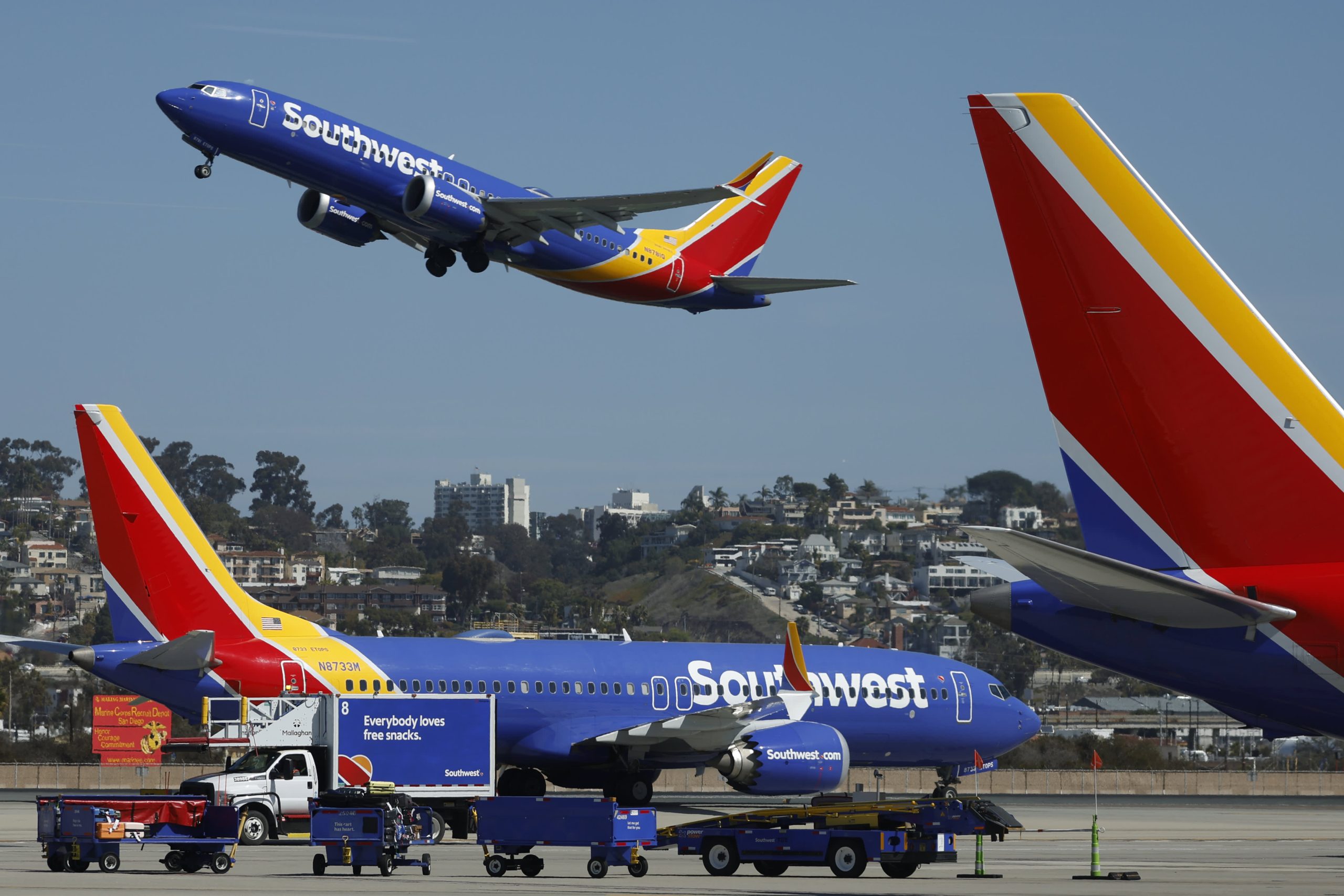 A Southwest Airlines Boeing 737 MAX8 departs from San Diego International Airport to Chicago on March 4, 2025 in San Diego, California.