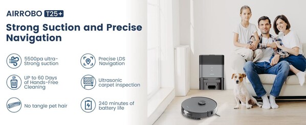 Equipped with a combined dustbin and water tank, the T25 Plus seamlessly transitions between vacuuming and mopping, offering a comprehensive cleaning solution in one compact unit. With a remarkable 240-minute maximum runtime, it can handle large homes without needing a recharge, ensuring uninterrupted performance. The self-emptying base further enhances convenience, storing debris for up to 60 days before requiring manual intervention.