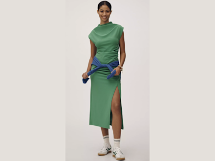 This ruched dress feels like a sweatshirt, but its sophisticated details make it look elevated. From the flattering (and concealing) ruching at the sides to the slit and cowl-neck, this dress is a throw-on-and-go style you’ll wear again and again.