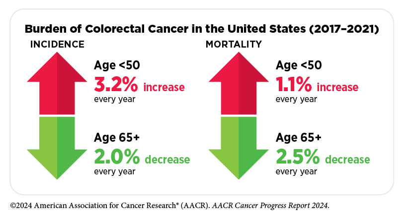 Although the big picture of progress against cancer looks good, there are some worrisome trends on a more granular level. More younger people are being diagnosed with and dying from certain cancers, including colorectal cancer. From 2017 to 2021, the rate of these cancers rose by more than 3% per year among people younger than 50 — even as the rate fell by 2% among people older than 65, according to the AACR report. And the rate of under-50s dying from colorectal cancer has risen by about 1% annually.