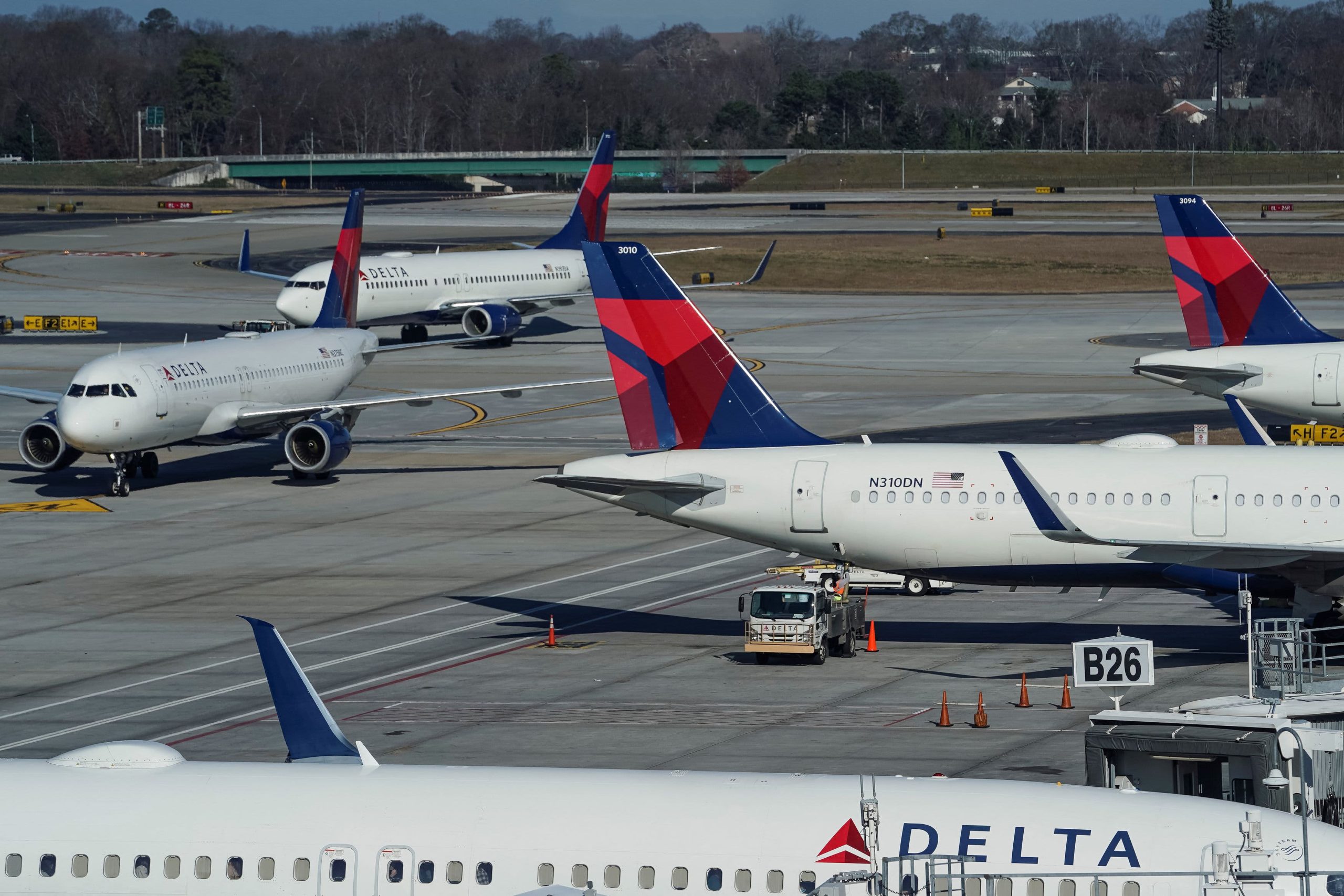 Delta Air Lines jets are seen on a taxiway at Hartsfield-Jackson Atlanta International Airport in Atlanta on Dec. 22, 2021.