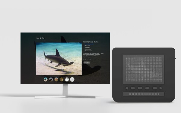 DotVista offers two main features: Accessible Zoo and Fruits Classification. Accessible Zoo enables visually impaired students in the classroom to explore shapes of animals and iconic historical monuments such as the Eiffel Tower through touching the braille dots from the Dot Pad tactile display. In addition, Fruits Classification, a commercial feature, can assist visually impaired workers with evaluating product quality – such as fruit freshness by providing both tactile and descriptive information, enhancing their interaction and understanding of fresh produce.