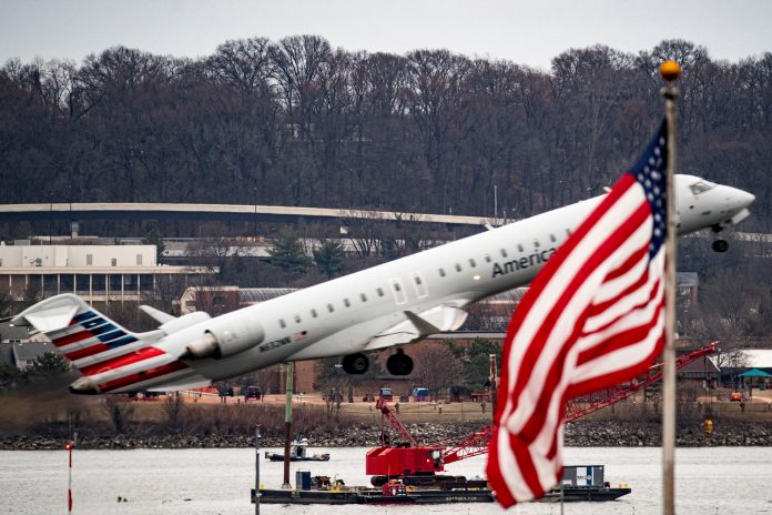 An American Airlines plane takes off as a salvage barge with a crane is positioned near the crash site along the Potomac River after a passenger jet collided with a helicopter while landing at Ronald Reagan Washington National Airport (DCA) in Arlington, Virginia, US, on Sunday, Feb. 2, 2025.