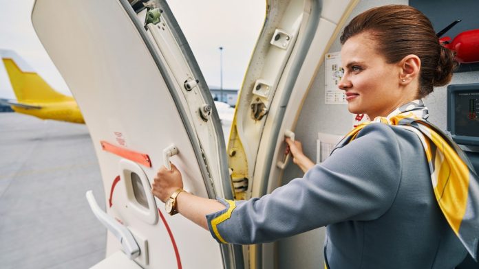 flight attendant closing the plug door before the take-off