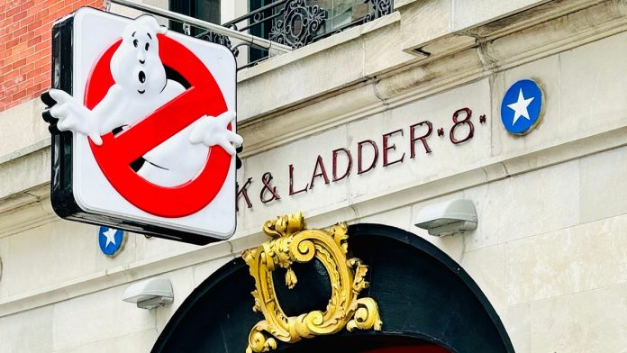 The pop-culture icon ghost appears on the Ladder 8 truck, uniform patches and hangs from the firehouse facade — in addition to the sidewalk out front.