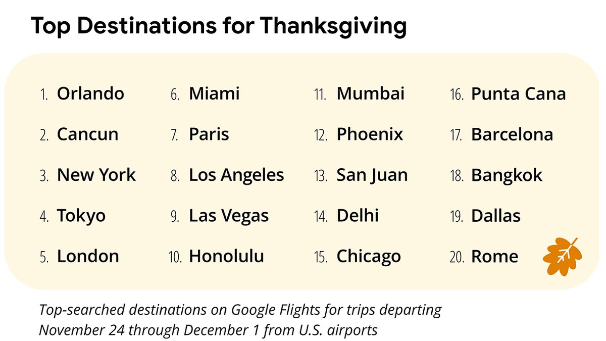 Google Flights revealed the top searched destinations for trips departing from Nov. 24 through Dec. 1, for the Thanksgiving holiday. (Google)