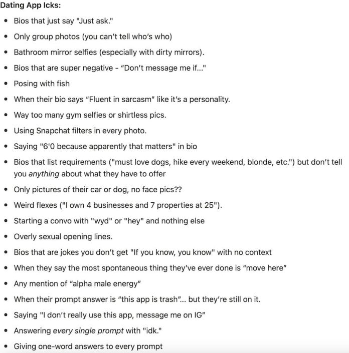 It’s her list of online dating “icks,” behaviors or profile descriptions that are so instantly repulsive to her she can’t look past them. Coco estimates that the list is about 50 items long. Her running tally of things that give her “the ick” on in-person dates is shorter “but always growing,” Coco tells Yahoo Life.