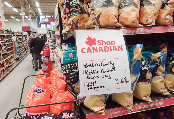 Grocery stores have encouraged visitors to “shop Canadian” with signs and special labels in aisles alerting them to which products were made domestically. A popular Facebook group focused on buying Canadian-made goods first reported on by NBC News has seen its membership more than double since early February as the on-again-off-again tariff policy played out.