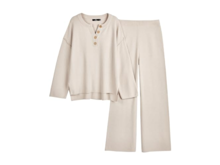 Made of a mix of cotton and acrylic, the sweater set is both comfy and flattering. The long-sleeve top hits right at the hips, so you can let it hang loose or tuck it into the pants depending on your mood that day. Speaking of the pants, they come with an elastic waistband so you can easily slip ’em on. Meanwhile, the slight flare at the bottom adds a touch of chic that stops it from looking frumpy.