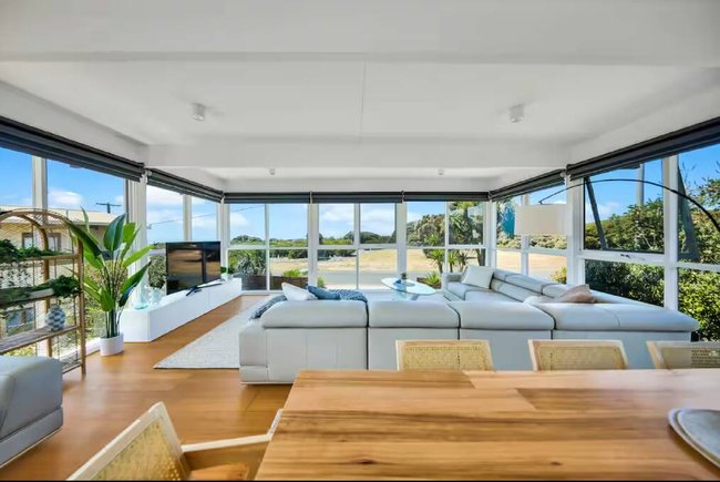 Located in a prime Jan Juc spot directly opposite the beach, the surfy beach house boasts “the best location, artwork & Jan Juc coastal views,” offering guests a relaxed vibe.