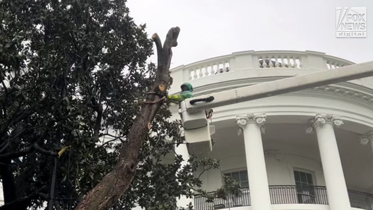 Arborists, in coordination with the White House Grounds team and NPS, cut the tree down in sections using a chainsaw, then lowered the parts with wires. (Ashley DiMella/Fox News Digital )
