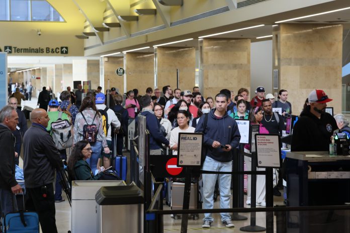 Traveler wait in a long security line at John Wayne Airport in Santa Ana Wednesday, May 7, 2025.