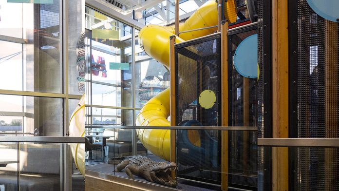 There is also a play area that includes a tube slide, physical activities and space-themed characters.