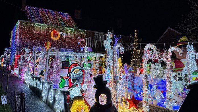 Ross and Michelle Clark turn their home into a winter wonderland covered in an assortment of lights and other holiday displays. (SWNS)
